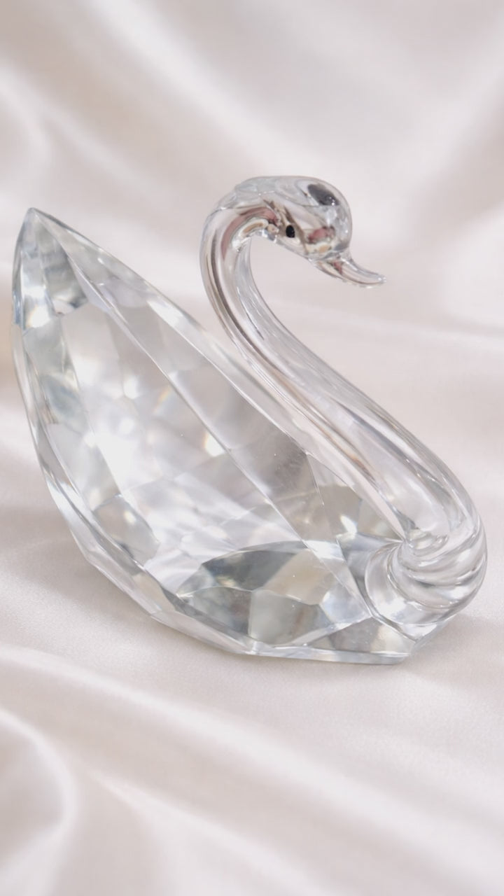 elegant crystal swan figurine is crafted from clear faceted glass, designed to catch and reflect light beautifully. The swan’s curved neck and geometric body give it a graceful, timeless silhouette.